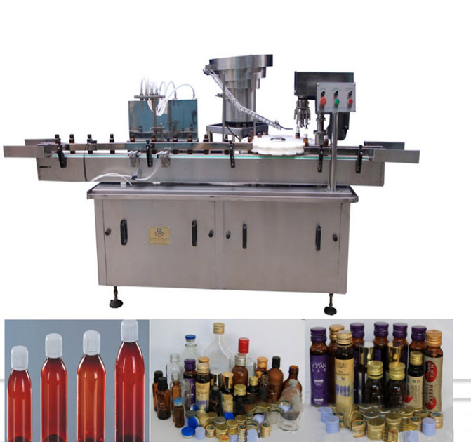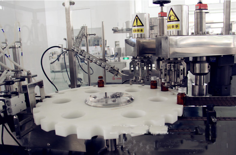 該西林瓶灌裝壓塞鎖蓋機集自動進瓶、理蓋、上蓋、抽吸真空、旋蓋、出瓶于一體,生產效率高,運行穩定可靠;西林瓶灌裝壓塞鎖蓋機的真空度可按需要設定,使用旋合式旋蓋原理和全密封真空式結構;該西林瓶灌裝壓塞鎖蓋機自動化程度高,設計合理,主要是由瓶子輸送、理蓋、夾瓶掛蓋、旋蓋、電控等機構和抽真空系統組成;此西林瓶灌裝壓塞鎖蓋機能耗低、適應性好,旋蓋機構高度可調節,適應相同口徑、不同高度的瓶子旋蓋;更換部分零件即可實現不同瓶徑、不同口徑的旋蓋,更換快捷方便;夾瓶子的托爪帶有膠墊,真空罩、旋蓋、配蓋機構都是氣缸驅動,在使用過程中都能做出精確調整,動作靈活;送蓋機構有光電感應安全保護裝置,可實現無蓋開機送蓋,蓋滿關機不送蓋;
