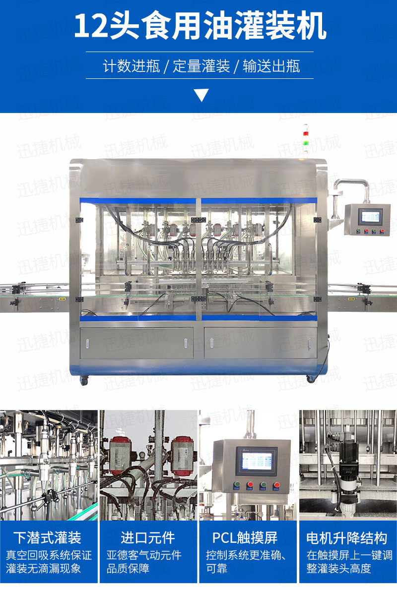 該系列玻璃瓶灌裝機采用容積式計量灌裝原理,適用于各種規(100ml-1000ml)的南瓜籽油、榛子油、牡丹籽油、芝麻油、核桃油、山茶油、亞麻籽油、棉籽油、橄欖油、大豆油、玉米油、菜籽油等食用油灌裝。設備采用伺服驅動活塞計量,保證了 1‰的灌裝精度,在保證灌裝精度的同時,提高了 20%-35%灌裝速度,操作簡單,維護方便,節省人工成本,生產效率更高。