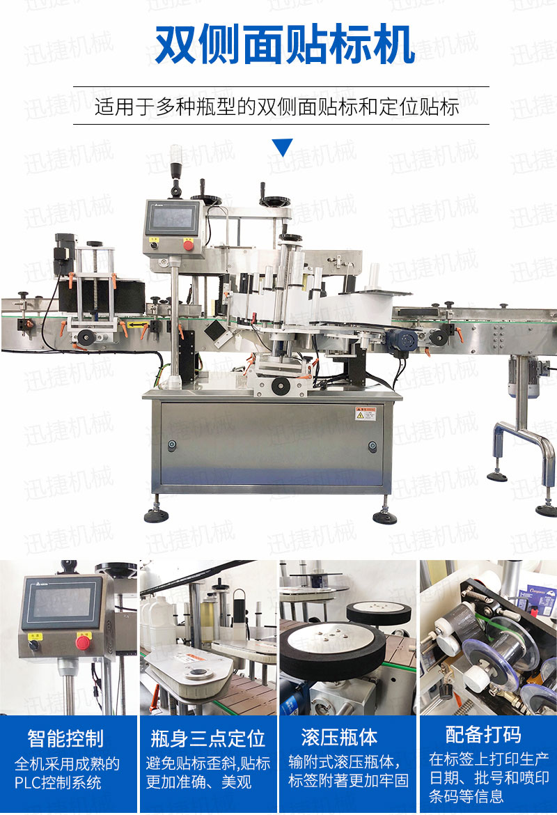 全機采用的技術,微電腦-PLC-電子光纖傳感器控制系統,使整機運行穩定、高速; 操作系統采用操作界面控制,操作簡便、實用、效率高,并有產量記數功能; 技術的速度快且穩定; 適用范圍大,可用于各種尺寸的圓形瓶貼標; 輸附式滾壓瓶體,使標簽附著更加牢固; 前后段可選連線使用。